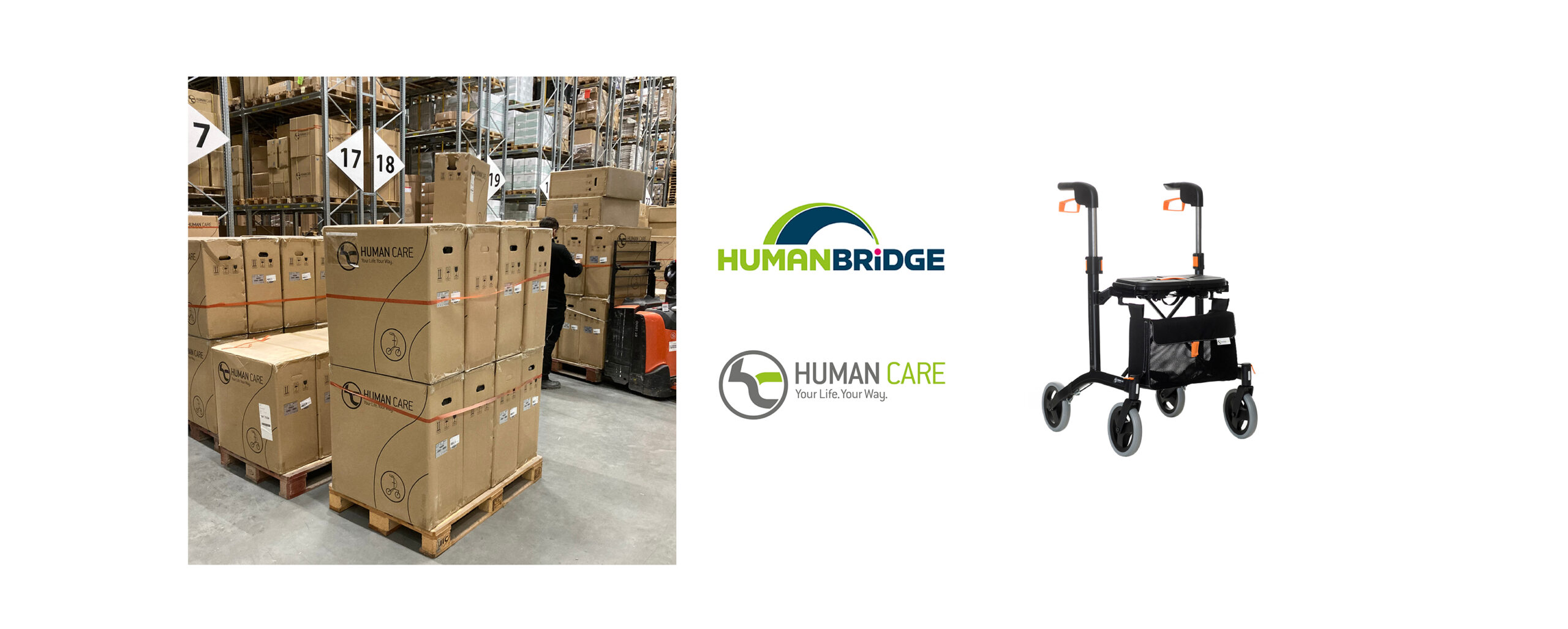 Human Care decided during 2022 to develop its social responsibility program to include more aid and charity organizations and has started a cooperation with tha aid organization Human Bridge. The first donation to Human Bridge consists of 446 rollators of the Leila brand and includes several different sizes and colors. The rollators are completely new and unused and are delivered in their original packaging. The market value of the donation corresponds to 1,351,000 SEK. The donated rollators will now be stored at Human Bridge’s warehouse in southern parts of Sweden for further transport in various aid consignments.